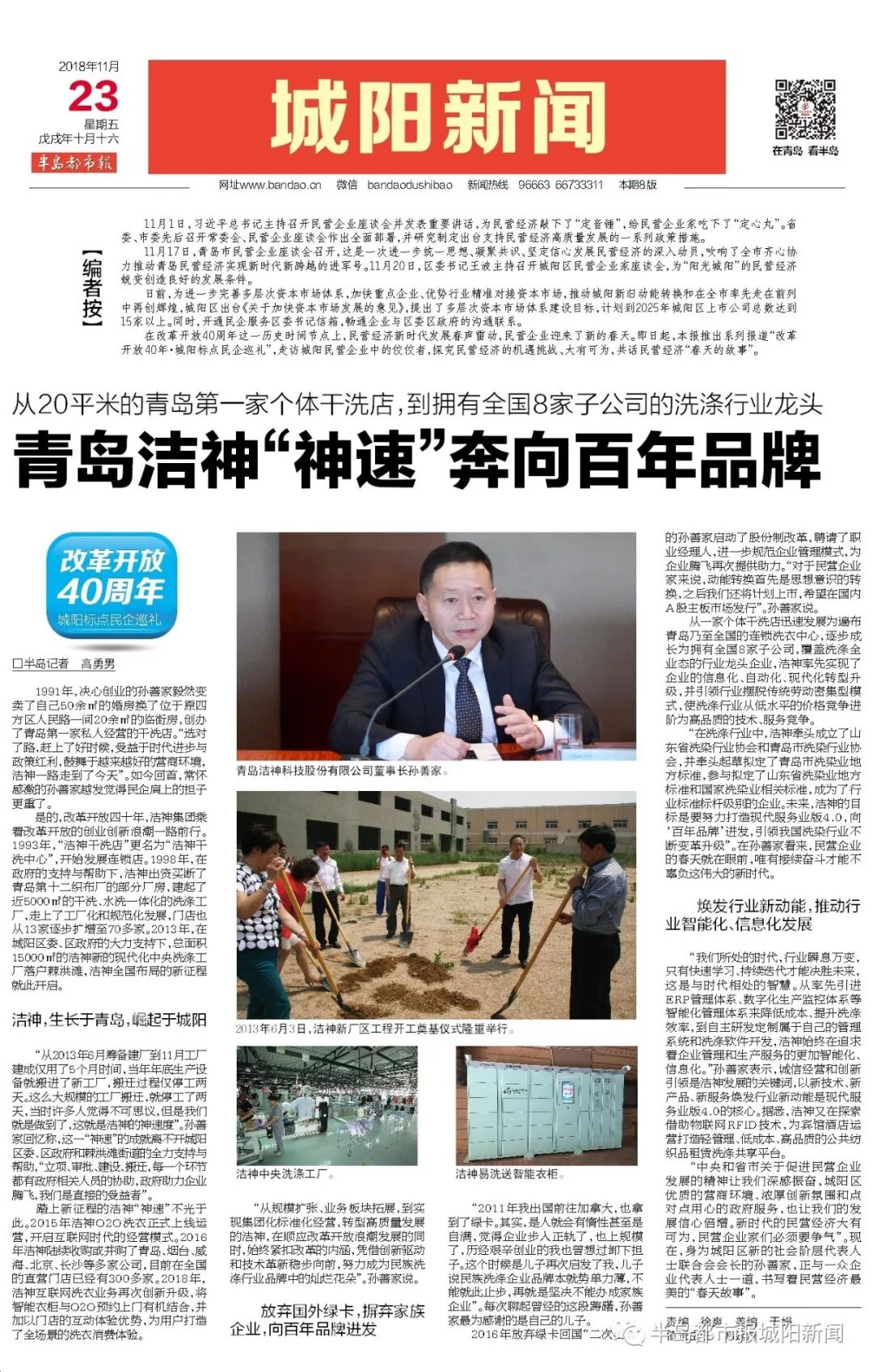 1991年,决心创业的孙善家毅然变卖了自己50余㎡的婚房换了位于原四方区人民路一间20余㎡的临街房,创办了青岛第一家私人经营的干洗店。“选对了路,赶上了好时候,受益于时代进步与政策红利,鼓舞于越来越好的营商环境,洁神一路走到了今天”。如今回首,常怀感激的孙善家越发觉得民企肩上的担子更重了。